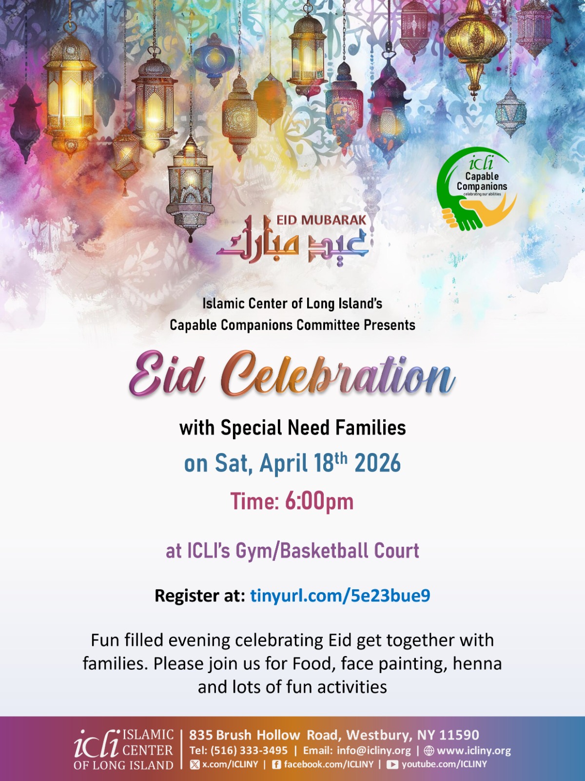 Assalamu Alaikum wa Rahmatullahi wa Barakaatuh Dear Respected ICLI Community Members, Islamic Center of Long Island’s Capable Companions Committee Presents Eid Celebration with Special Need Families on Sat, April 18th , 2026 Time: 6:00pm at ICLI’s Gym /Basketball Court