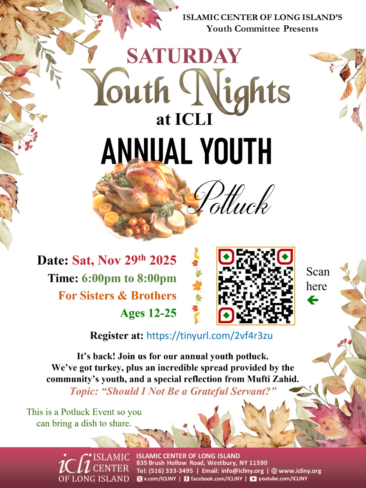 It’s back! Join us for our annual youth potluck. We’ve got turkey, plus an incredible spread provided by the community’s youth, and a special reflection from Mufti Zahid. Topic: “Should I Not Be a Grateful Servant?”